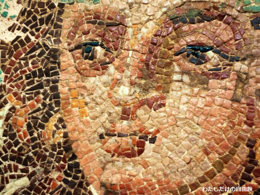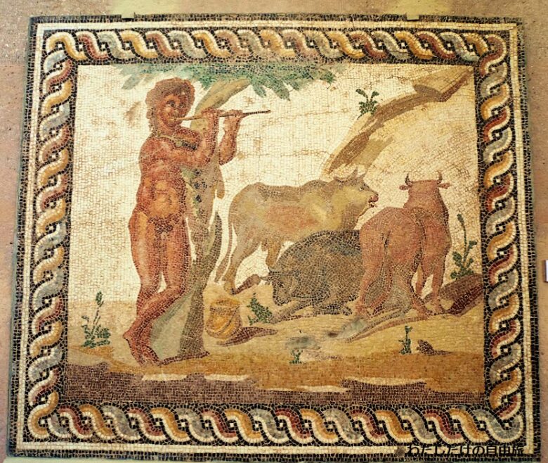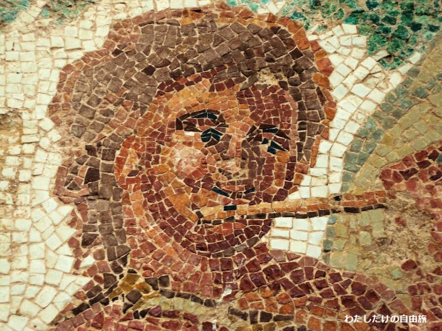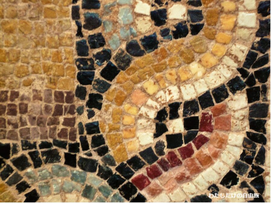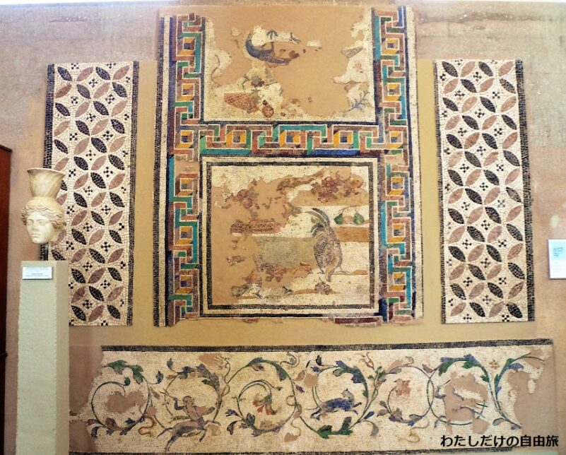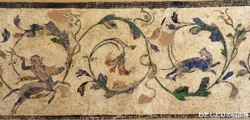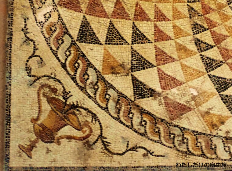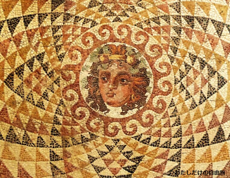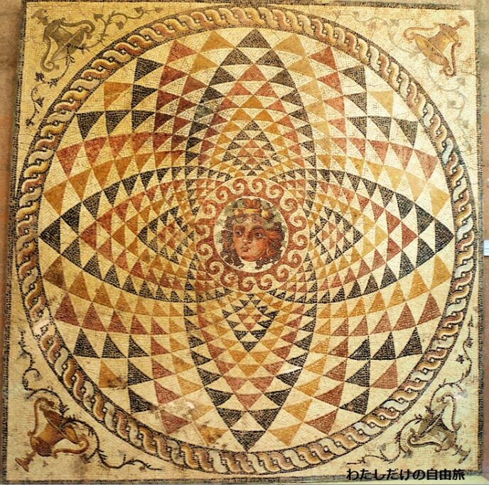 こちらも、ローマ時代の邸宅のモザイク床。四隅に描かれているのは、ツタが絡まったカンタロス(器)。中央にはツタと果物を髪に絡ませたディオニュソスの顔が描かれている。西暦150年~300年頃のもの。