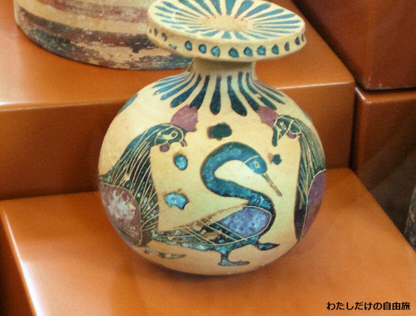 こちらは、香油などを入れていた小さな壺、アリュバロス。かわいらしい絵柄。