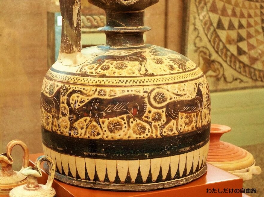 こちらの美しい壺は、動物が描かれたオイノコエ、紀元前600年頃のもの
