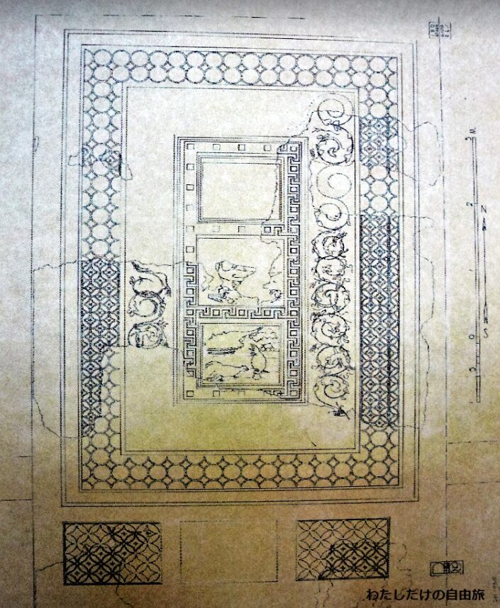 ローマ時代の豪邸のダイニングルームを飾っていました。2世紀または3世紀初頭に敷設(ふせつ)されたもので、元来の大きさは、約5m × 9mです。