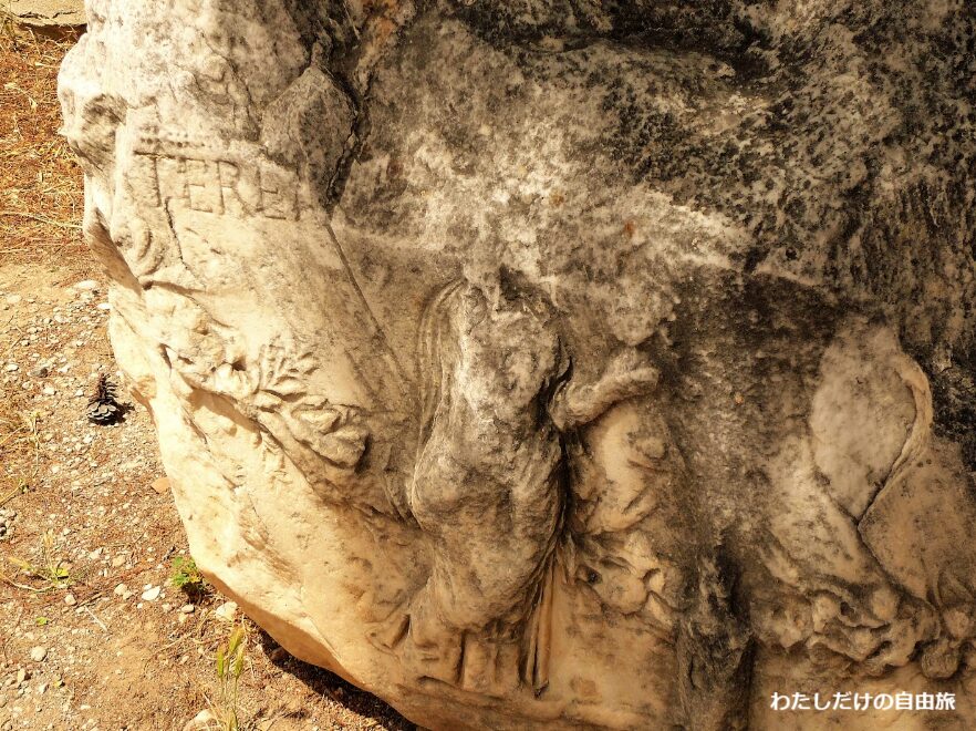 冒頭写真:彫刻のある石の遺物、コリントス遺跡