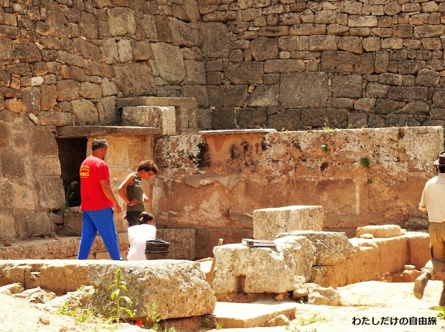 さて、ジュリアン・バシリカ跡を南下していくと、サークル状に設置された石積周りにきれいな石の舗装が見えてくる(気になるも、この石の舗装についての展示ボードはなく、何も情報を得ることはできなかった)。