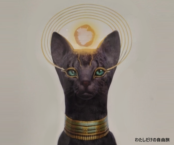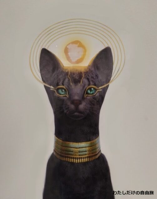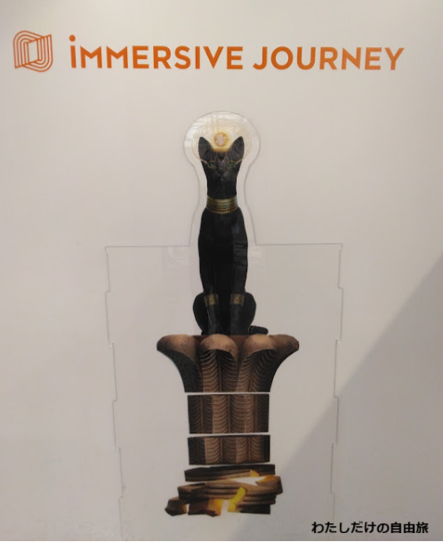 バステト神と記念撮影できます(受付で事前に撮影スポットを確認していたので、スマホを持っていました。VR体験中は、スマホは機内モードにするか、電源を切っておく必要があるそうです)。